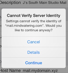 If you wish to proceed anyway, you can try just clicking Save after seeing the following dialog. You will definitely have incoming mail, for e-mails you receive, but may not have outgoing mail, for e-mails you send, set up properly. For example, our iPhones on AT&T and Verizon can send outgoing e-mail, but we we connect to a hotel wireless or other hotspot, we can often no longer send SSL e-mail, and often no e-mail at all via the outgoing mail settings (SMTP 25 and 587). There blocks are on purpose generally as an easily effective way for people to block spam e-mail leaving their networks. If you are on a home wireless, you should use the SAME OUTGOING SMTP SETTINGS as your ISP gave you for your e-mail account with them.